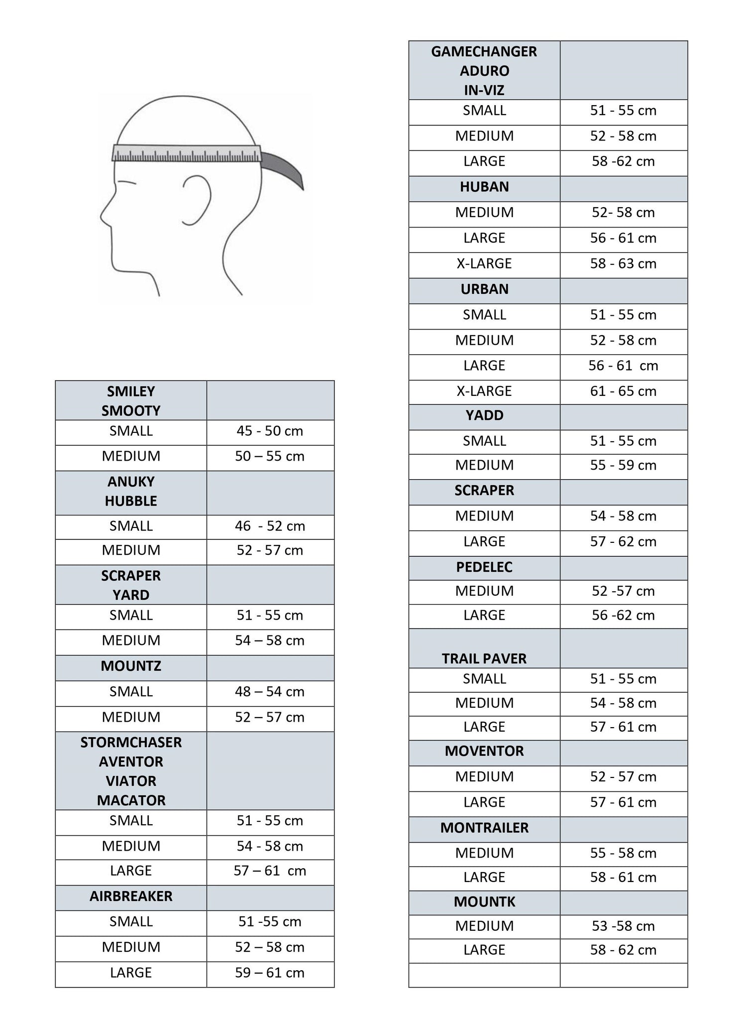 A page showing how to measure your head for an Abus helmet, along with the sizes of various Abus helmet models.